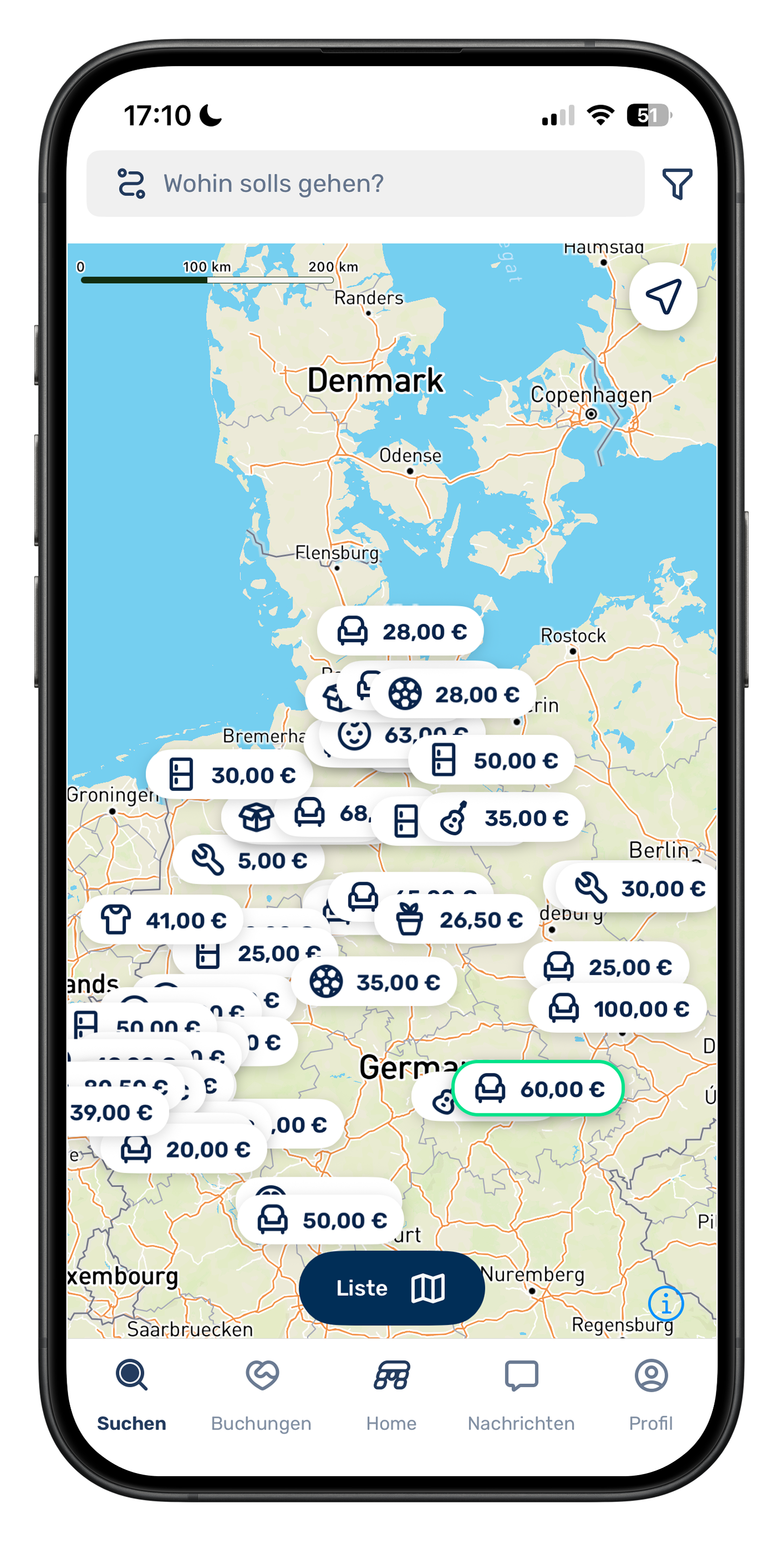 Die Kartenansicht in der MUVN App dient dir als zentrale Übersicht über alle aktuell verfügbaren Gegenstände in ganz Deutschland. Statt einzelne Anfragen manuell zu durchsuchen, kannst du auf der Deutschlandkarte direkt sehen, wo sich Transportmöglichkeiten befinden und zu welchem Preis sie angeboten werden.