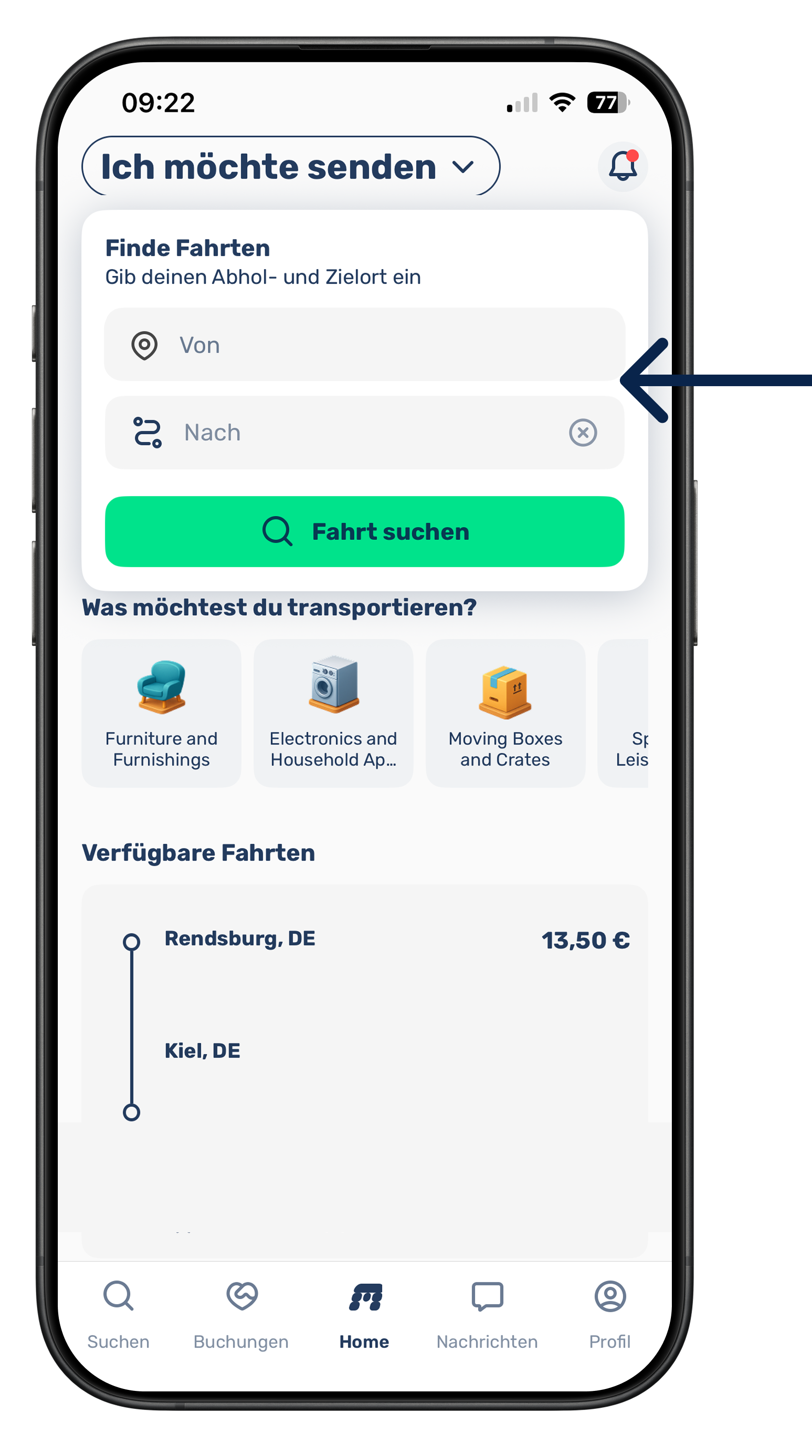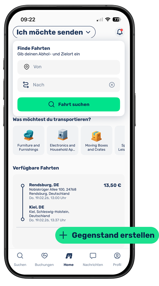 Wenn du ein Transportgesuch erstellst, können sich Fahrer:innen melden, die sowieso eine passende Route fahren oder in deiner Nähe unterwegs sind.