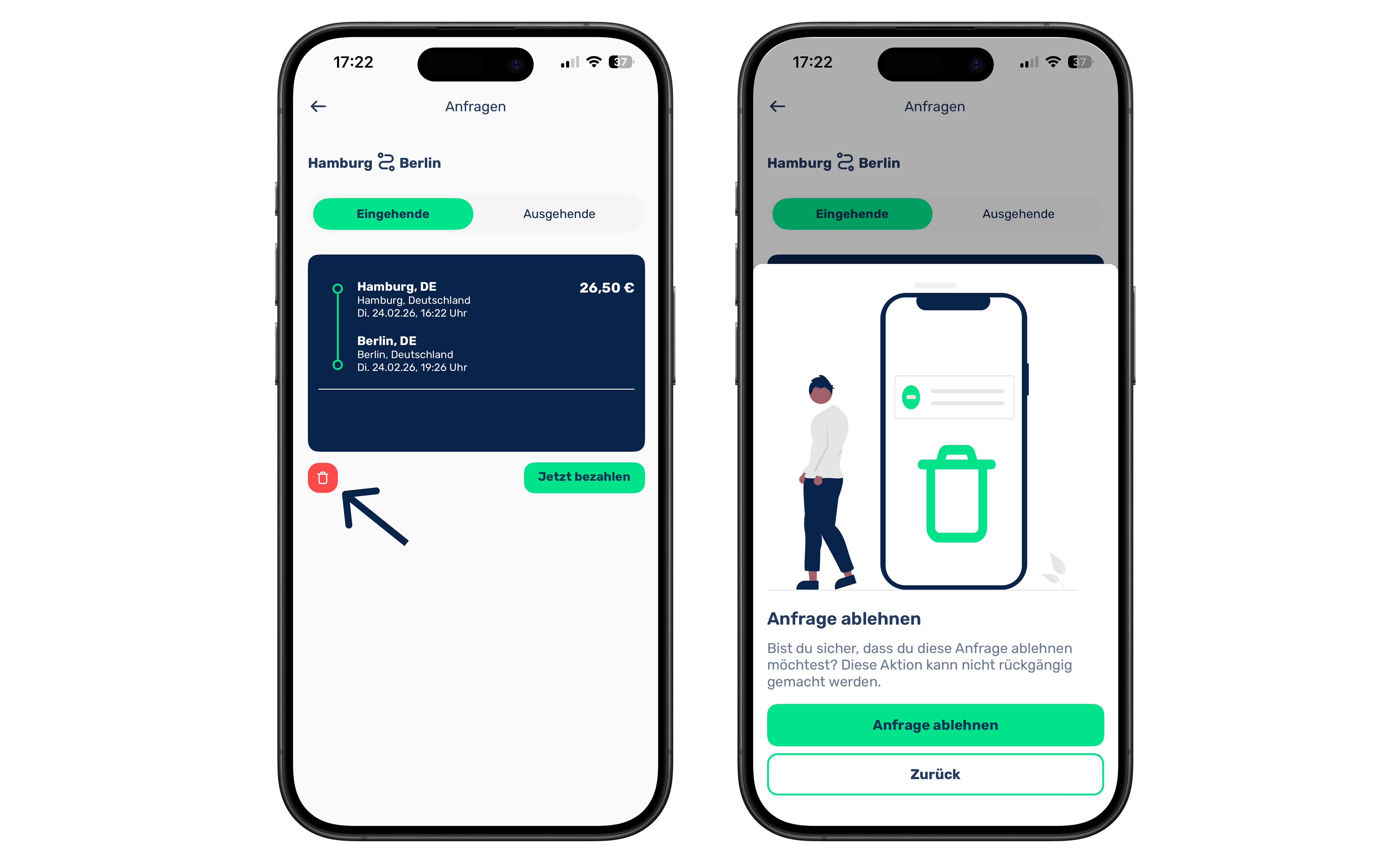 Eine Stornierung ist grundsätzlich möglich. Du kannst deine Fahrt direkt über die App verwalten und bei Bedarf stornieren.